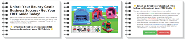 "Email us today to receive your in depth 70+ page intensive bouncy castle hire startup guide Free of charge! Info@better-bounce.co.uk" or click on the link below to checkout FREE online!