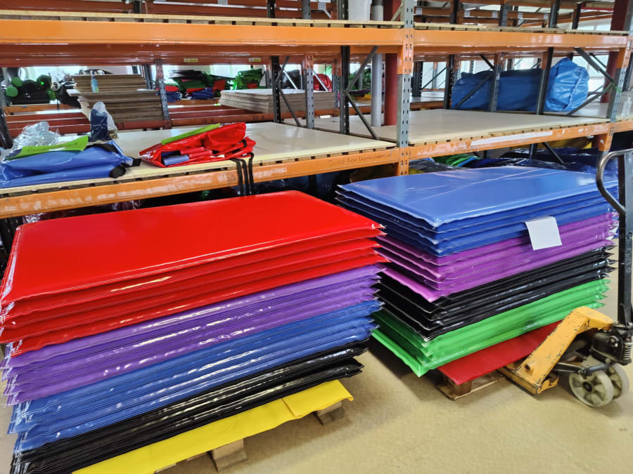 Our PVC bouncy castle mats are sandwich style mats sewn externally to give 2 flat surfaces and 4 flat external seams and no internal pressure. This method allows the mats to remain flat, firm and to stop unnecessary wear and tear or delamination from high traffic on folded PVC. PVC is not designed to be folded under load for long periods of time and why you often see internal seam mats cracking and splitting prematurely. The mats are manufactured in batches of 300 to bring the costs down through volume. We do not compromise on materials.