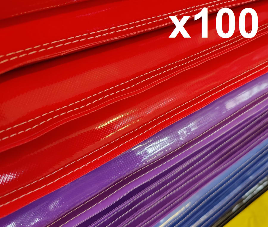 Our PVC bouncy castle mats are sandwich style mats sewn externally to give 2 flat surfaces and 4 flat external seams and no internal pressure. This method allows the mats to remain flat, firm and to stop unnecessary wear and tear or delamination from high traffic on folded PVC. PVC is not designed to be folded under load for long periods of time and why you often see internal seam mats cracking and splitting prematurely. The mats are manufactured in batches of 300 to bring the costs down through volume. We do not compromise on materials.