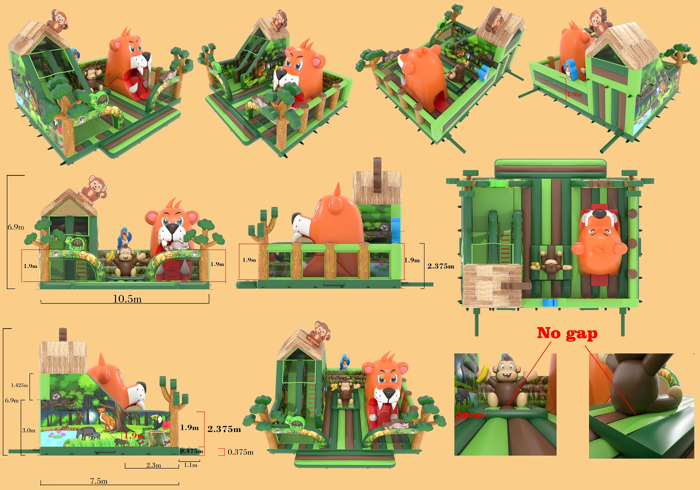 But that's not all! Our jungle-themed wonderland is full of surprises. At the heart of the inflatable jungle, there's a massive bear's head beckoning intrepid explorers to climb inside and venture through its mouth. As you exit, you'll slide past the big teeth, adding an extra layer of adventure to the journey.