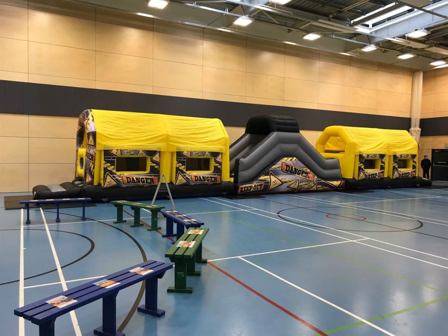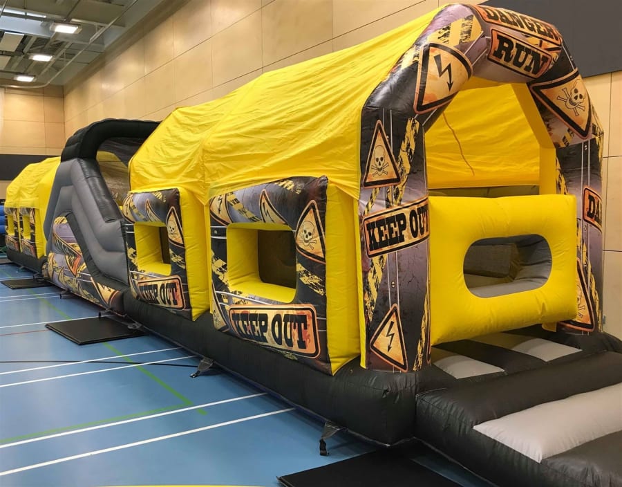 The all new Danger inflatable obstacle course for hire measure in at whopping 65ft in length yet is still perfect for both indoor and outdoor hire. 65ft is a brilliant length making it suitable for most domestic parties, pubs, clubs, schools, galas, scouts, cubs, guides and other community groups aiming to keep children entertained for longer periods of time than the standard bouncy castle for example.