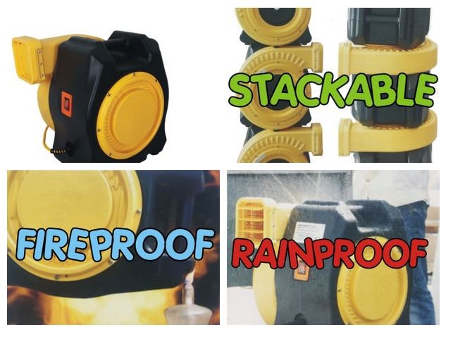 Fan best used for inflatables up to 15ft x 18ft in size, depending on the inflatable these fans can also be used with inflatables larger than this too. They can be dropped from up to 2m in height and will only have minor dents and surface scratches to the frame, due to the hard thick plastic build.