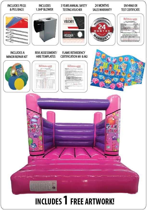 This castle can be made in a range of colours with a range of art work and we also have stock that is readily available should anybody need something urgently. This castle will last a long time if looked after and maintained correctly. This type of castle will fit in most gardens and the majority of indoor venues and due to its manageable size and weight, its can be set up and packed away by a single person without the need of any help.