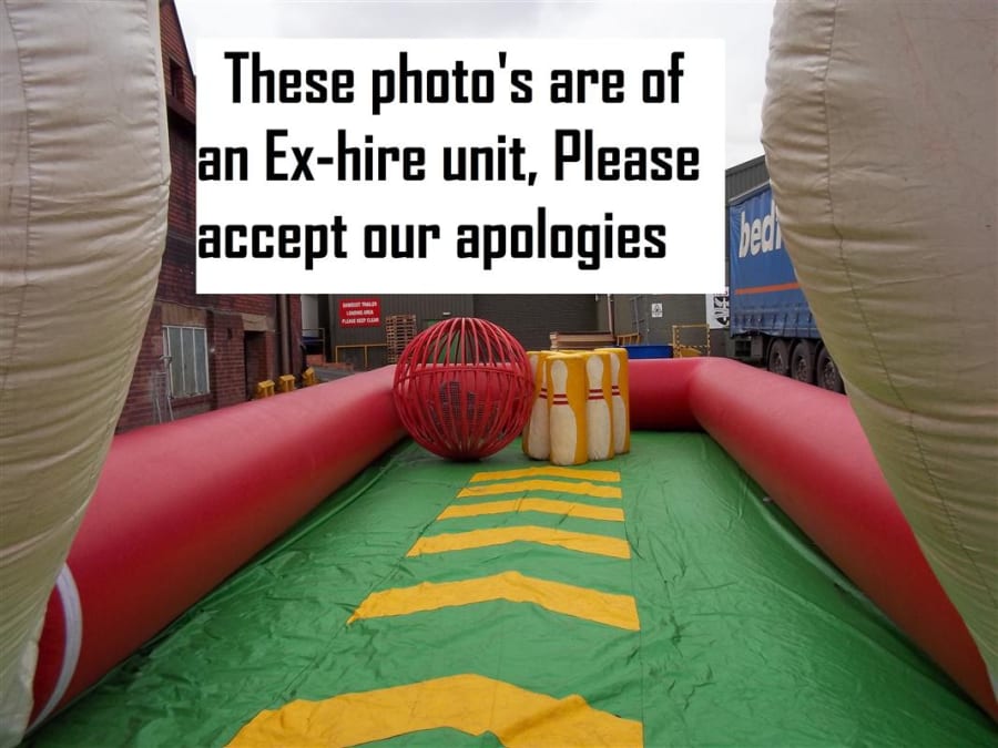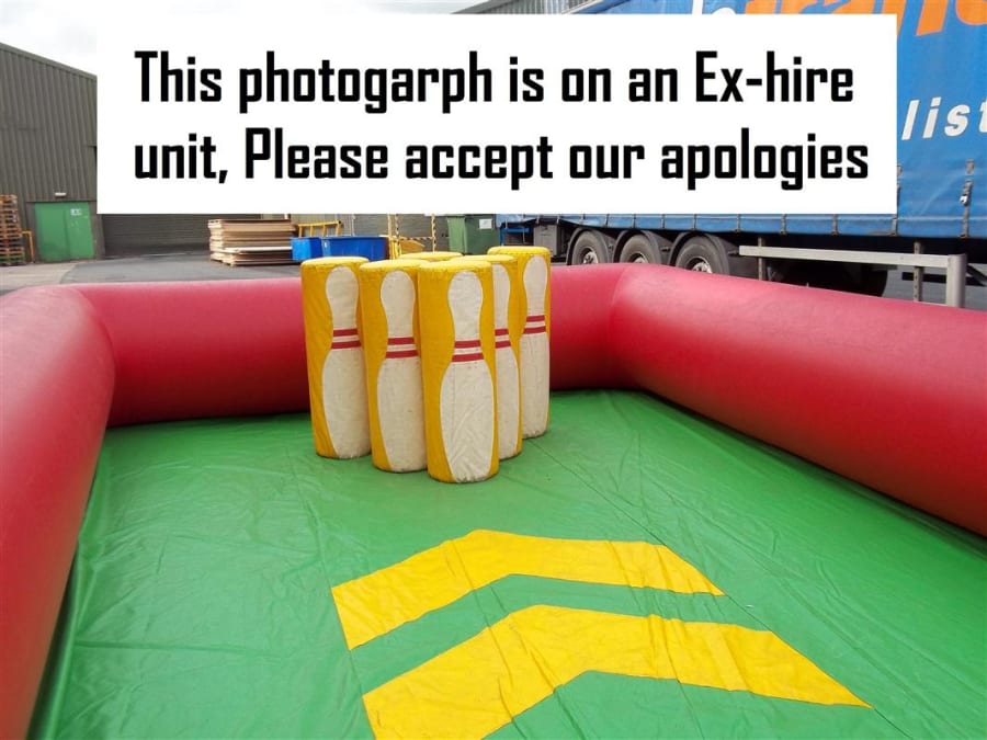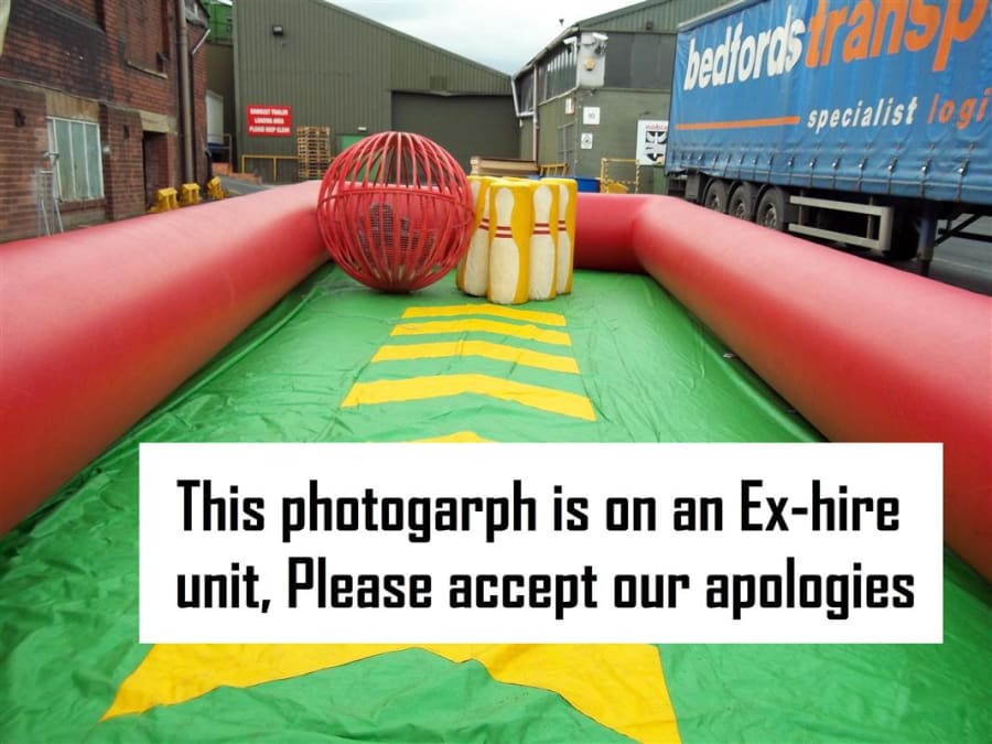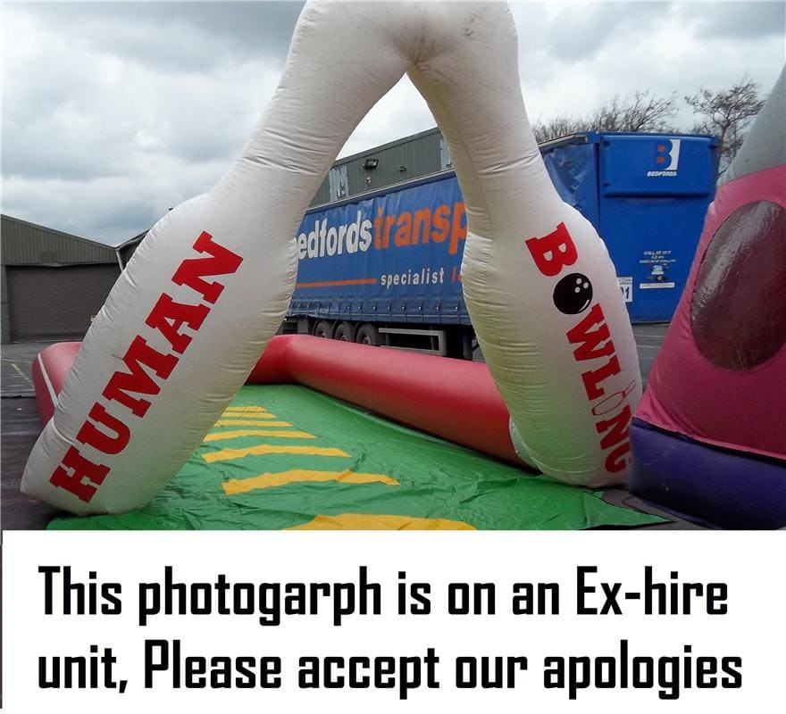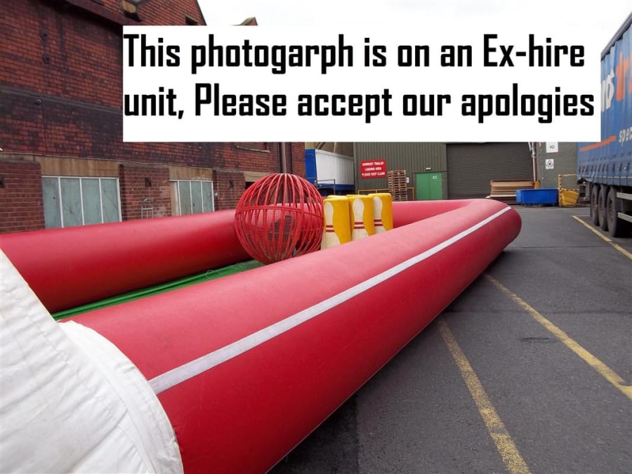 This is hilarious, strap the customer into the zorb ball and send them sailing down the alley into the foam skittles as a human bowling ball, the person who knocks the most down wins. This has been redesigned for this season making it safer than ever before. With the fully inflated high sided walls and foam build skittles nothing can be dangerous about this. As you can see from the photo's we use to use a steel fabricated bowling ball in our own hire company but have recently upgraded to a traditional inflated zorb ball with harness instead and we find it much easier to manoeuvre and would suggest anyone purchasing to do the same. This giant game is fantastic and works really well at paid events, its also a fantastic marketing stunt and its so eye catching and every body wants to have a go but its a who dares situation. The Inflatable Bowling Alley is a fantastic add on to anyone fleet and there is always a cue at our events for this mean machine.