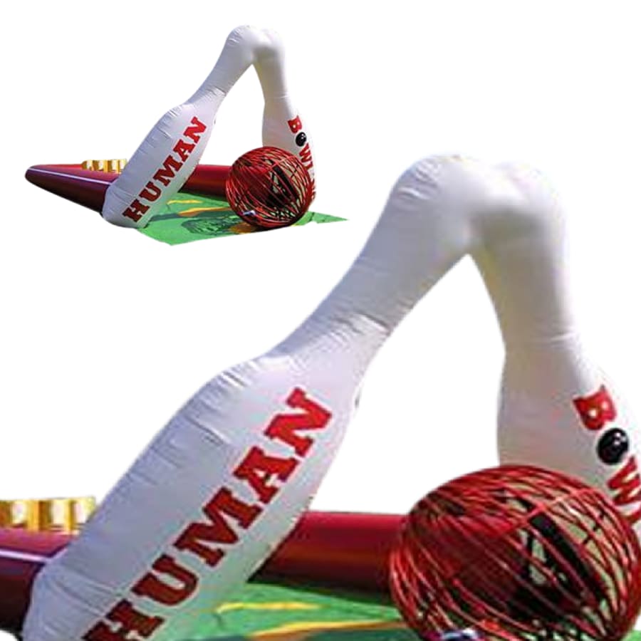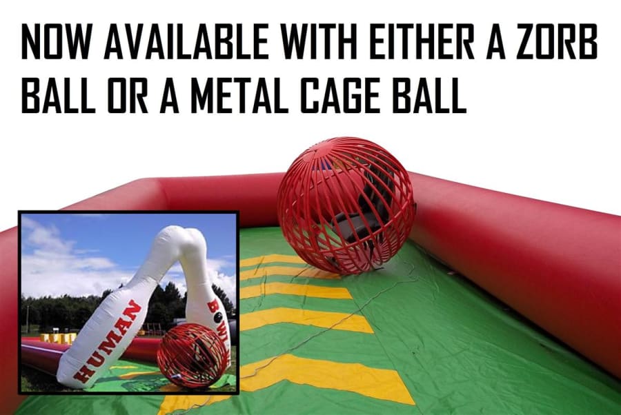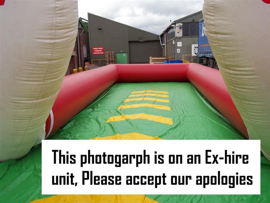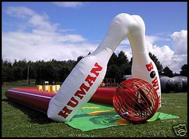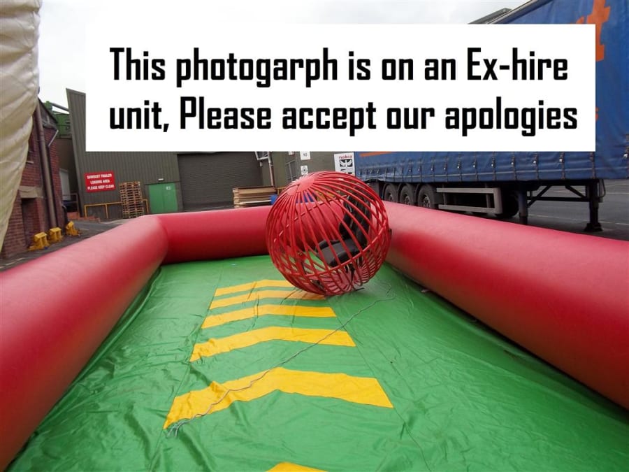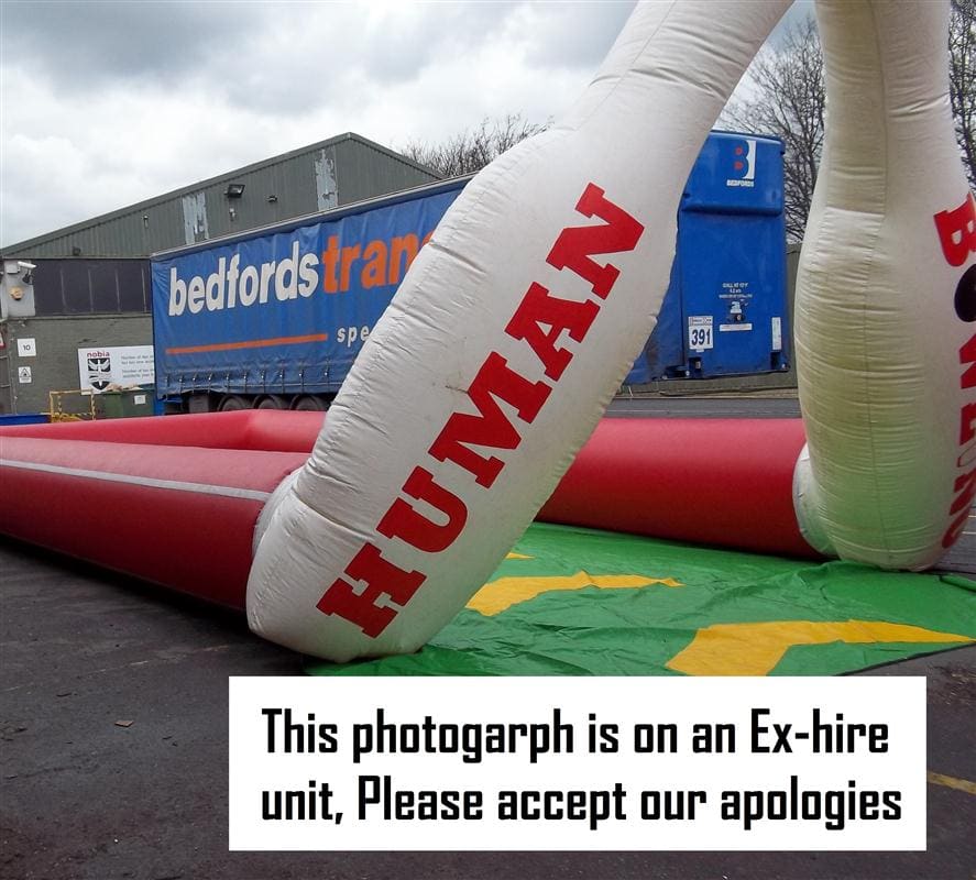 This is hilarious, strap the customer into the zorb ball and send them sailing down the alley into the foam skittles as a human bowling ball, the person who knocks the most down wins. This has been redesigned for this season making it safer than ever before. With the fully inflated high sided walls and foam build skittles nothing can be dangerous about this. As you can see from the photo's we use to use a steel fabricated bowling ball in our own hire company but have recently upgraded to a traditional inflated zorb ball with harness instead and we find it much easier to manoeuvre and would suggest anyone purchasing to do the same. This giant game is fantastic and works really well at paid events, its also a fantastic marketing stunt and its so eye catching and every body wants to have a go but its a who dares situation. The Inflatable Bowling Alley is a fantastic add on to anyone fleet and there is always a cue at our events for this mean machine.