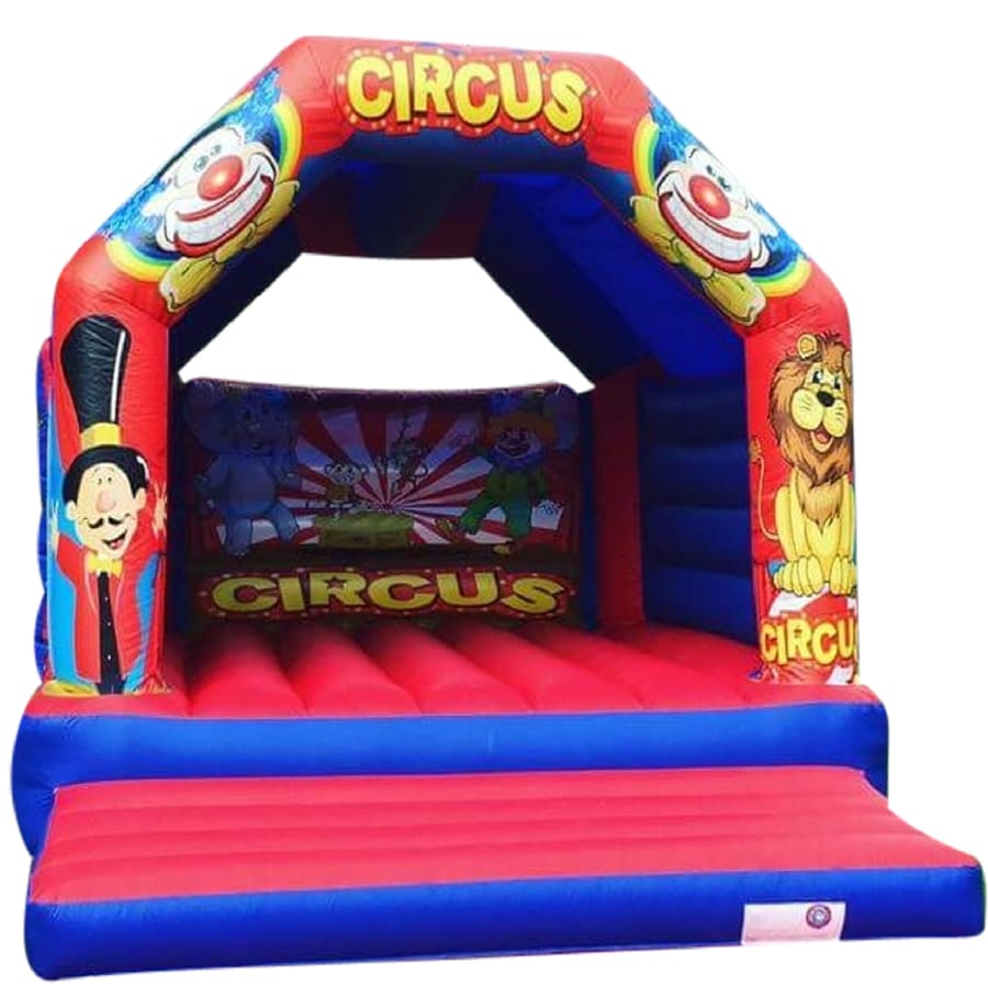 The Adult Red & Blue Circus Bouncy Castle for sale offers a large safety step at the front which makes it easy for getting on and off the inflatable safely. The built-in rain cover protects the users from light showers and strong sunlight, depending on the time of year, making it perfect for all the parties.