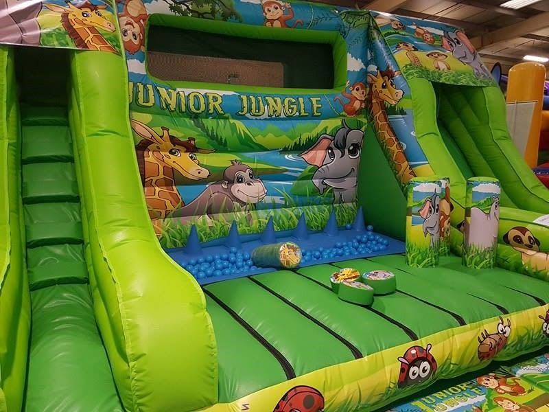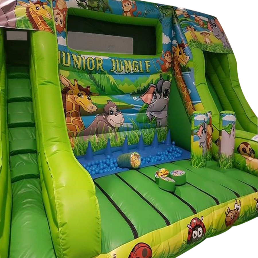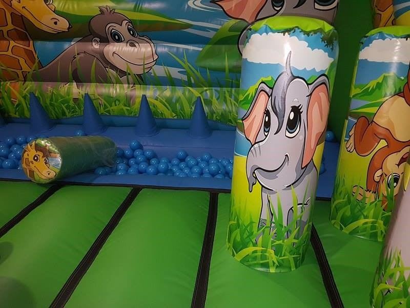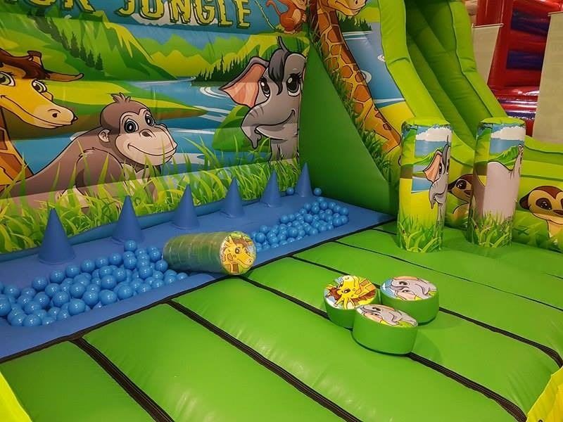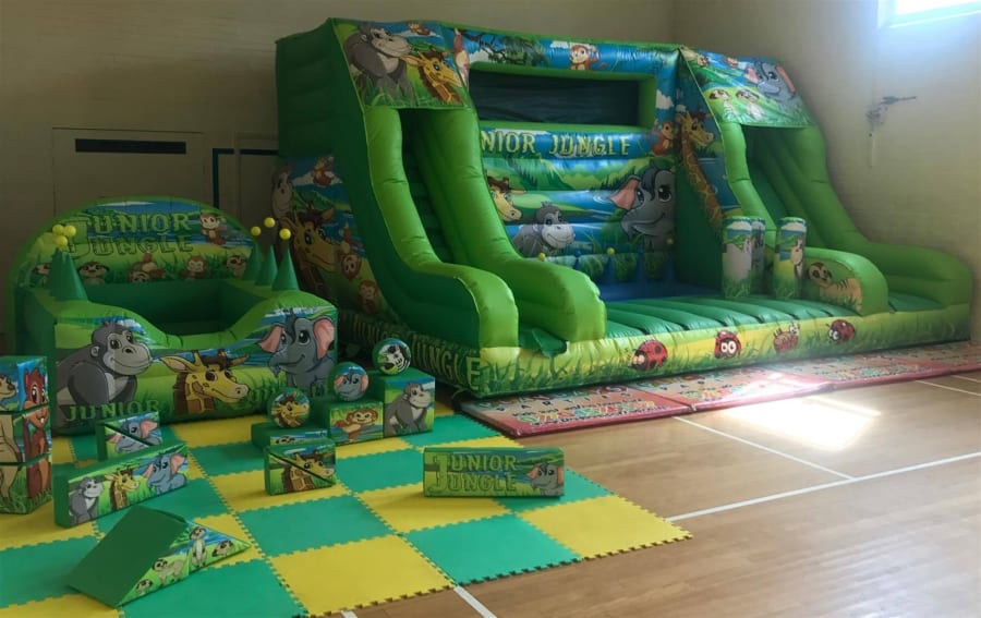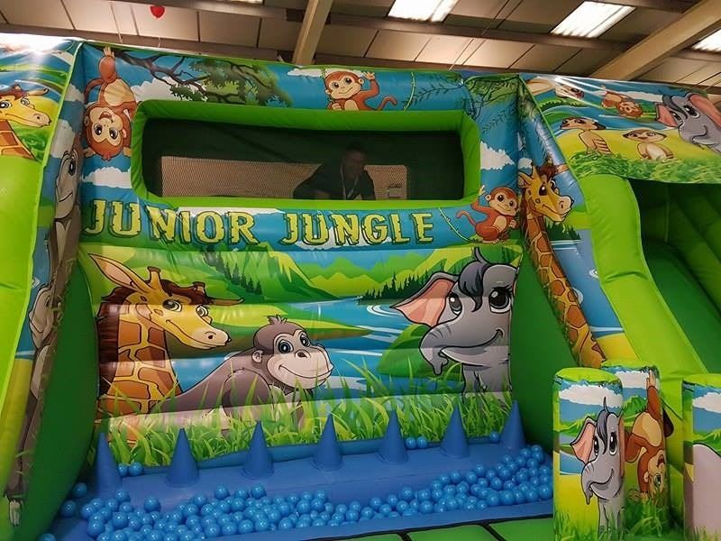The junior play zone is a self contained unit compromising of a bouncing area, multiple biff and bash posts and solid foam block steps enabling it to be used by all ages. a crawl through sky bridge and its very own ball pool.