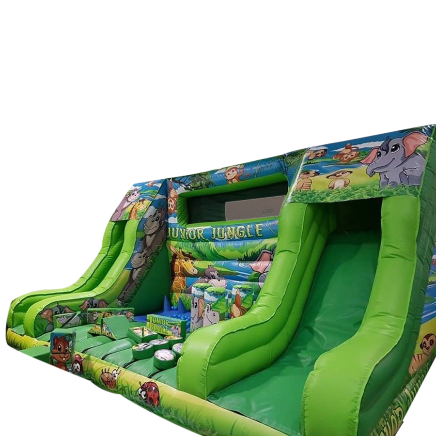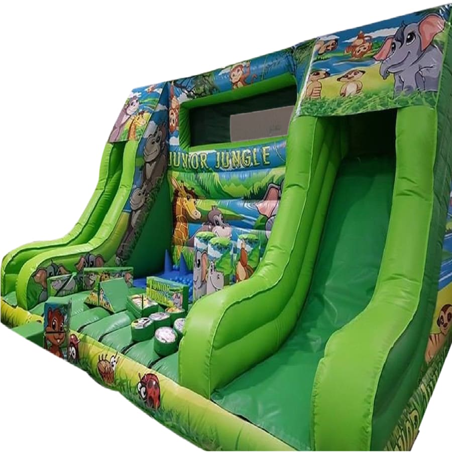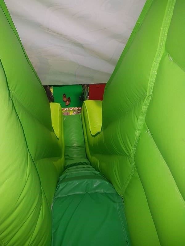 With a large cartoon digitally printed theme, this fun run is designed with a large assault like/ bouncing area but also with a slide so it gives the users that little extra excitement of a slide, biff and bash pillows with some foam block square steps at the end to help get the users to the top of the slide.Combine this with the ball pool swamp on the main bouncing area and your on to a winner!