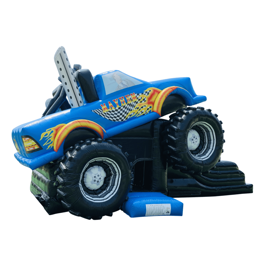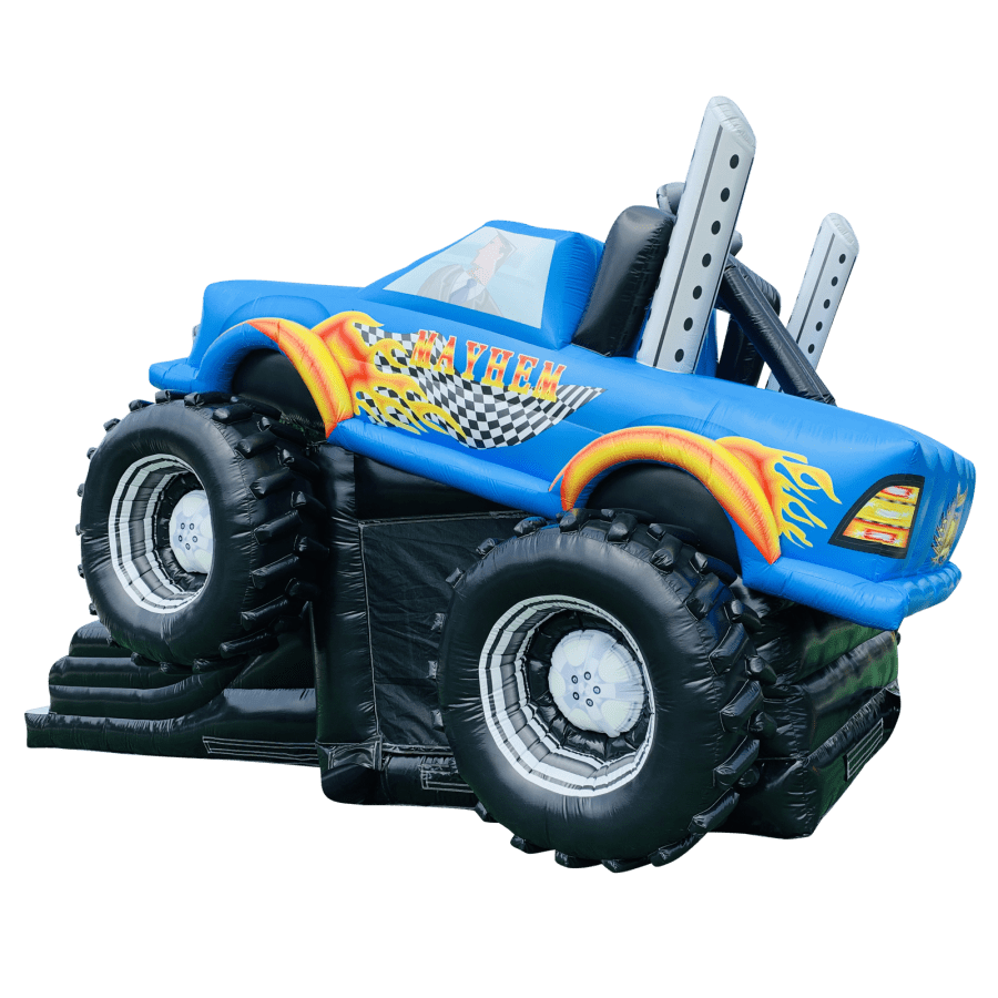 The Mayhem Monster Truck with Slide is a fantastic new addition to our fleet. The Monster Truck castle with slide combines 2 of the most popular items we manufcature in one extraordinary inflatable where space is at a premium. The Monster Truck with slide combo is the perfect combination slide for any party, venue or occasion and is ideal for all age groups. This brightly coloured piece of equipment provides the perfect bouncing area to bounce along with friends, whilst the slide provides entertainment for the rest of the guests at the same time and certainly won't break the bank.