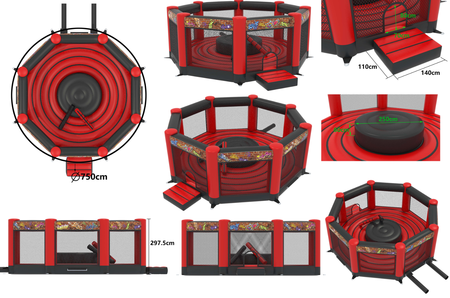 The sheer size and scale of the Ultimate Gladiator duel hire ensures visitors can see the attraction from miles around and is a fantastic way to draw in additional visitors to your event, fete, fair, school gala, pub, club, shopping centre or simply for a bit of light-hearted fun at a private party event or birthday bash. It's a fantastic team game and can be extremely competitive for all those taking part. The aim of the game is to battle against your opponent and force them out of the rocking ring just like the real coliseum fighters, best out of three attempts wins and the loser crashes out of the arena in style.