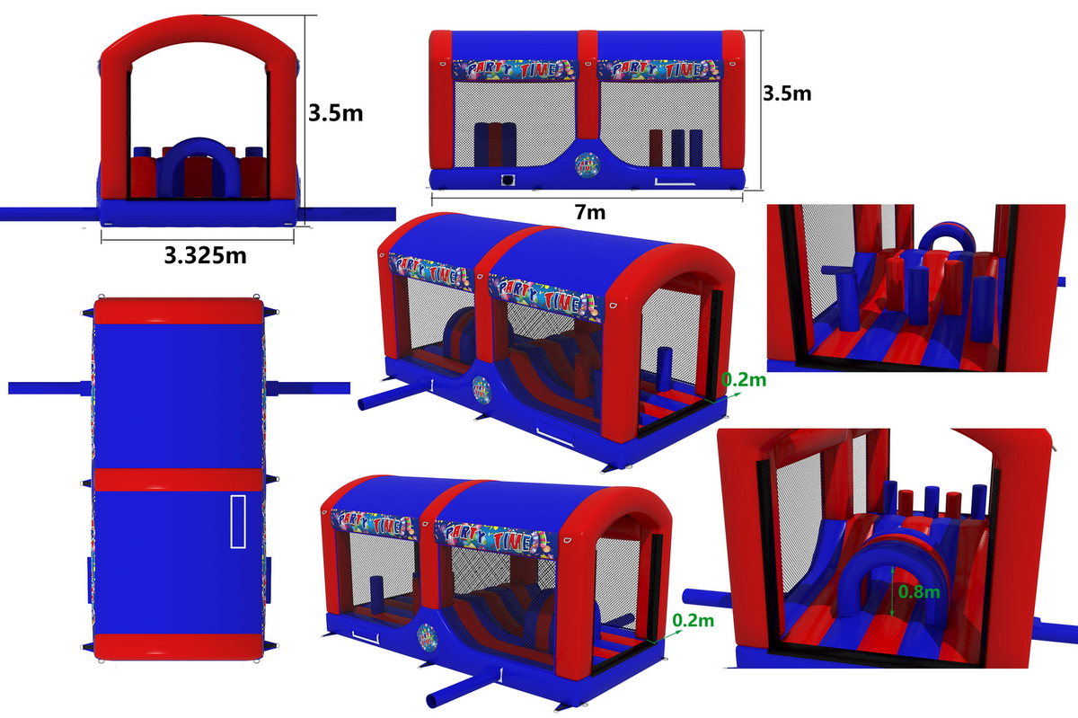 All extension pieces are designed to be located in the middle of the obstacle course and this exact listing is for 1x inflatable extension compromising of Crawl tunnel, crazy hump and biff and bash pillars in the middle. The piece is universal so can be rotated to aid with a quick and easy set up. The blower tubes are located next to one another to give a better set up on site in terms of blower and cable management.