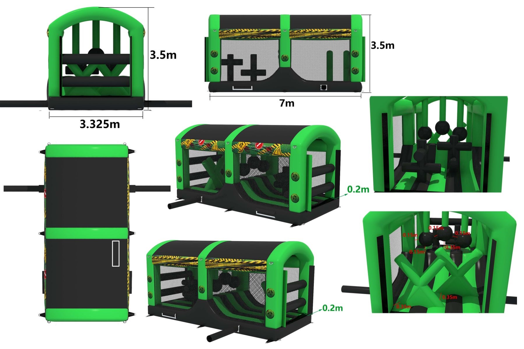 All extension pieces are designed to be located in the middle of the obstacle course and this exact listing is for 1x inflatable extension compromising of a set of entry cross mangles, followed by some X piece obstacles in the main section. Next up is the slippy hump midway with overhanging wrecking balls to negotiate and down the opposite side of the hump. Next up is the T coggers, followed swiftly with another set of Cross mangles at the end that really aren't as easy as they first look! The piece is universal so can be rotated to aid with a quick and easy set up. The blower tubes are located next to one another to give a better set up on site in terms of blower and cable management.
