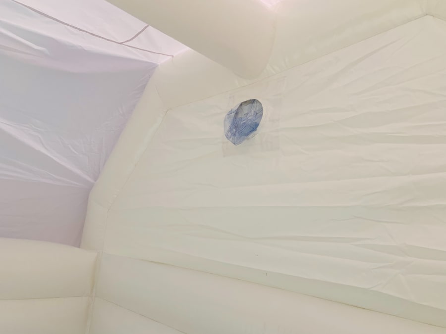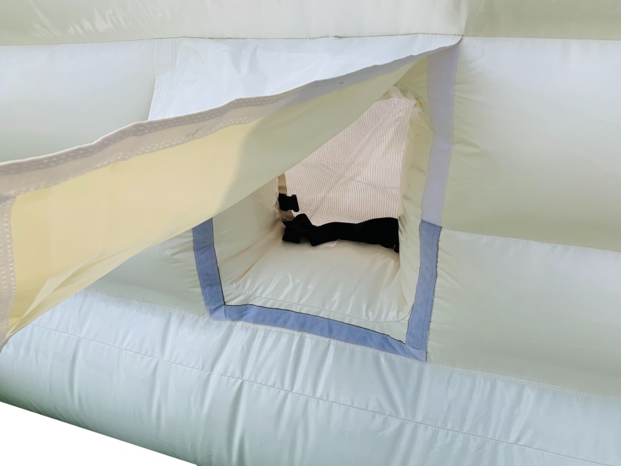 The Inflatable Disco Castle comes with a lighting slot in the top that accepts most kinds of disco lighting, this is placed inside a clear plastic tube that allows light to penetrate inside the castle creating some really good effects inside. The slot is then zipped closed and a velcro cap is placed over to keep it watertight but please bear with us in heavy rain as nothing is quite 100% waterproof