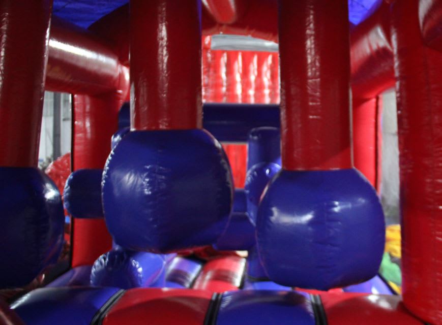 All extension pieces are designed to be located in the middle of the obstacle course and this exact listing is for 1x inflatable extension compromising of a set of entry cross mangles, followed by some X piece obstacles in the main section. Next up is the slippy hump midway with overhanging wrecking balls to negotiate and down the opposite side of the hump. Next up is the T coggers, followed swiftly with another set of Cross mangles at the end that really aren't as easy as they first look! The piece is universal so can be rotated to aid with a quick and easy set up. The blower tubes are located next to one another to give a better set up on site in terms of blower and cable management.
