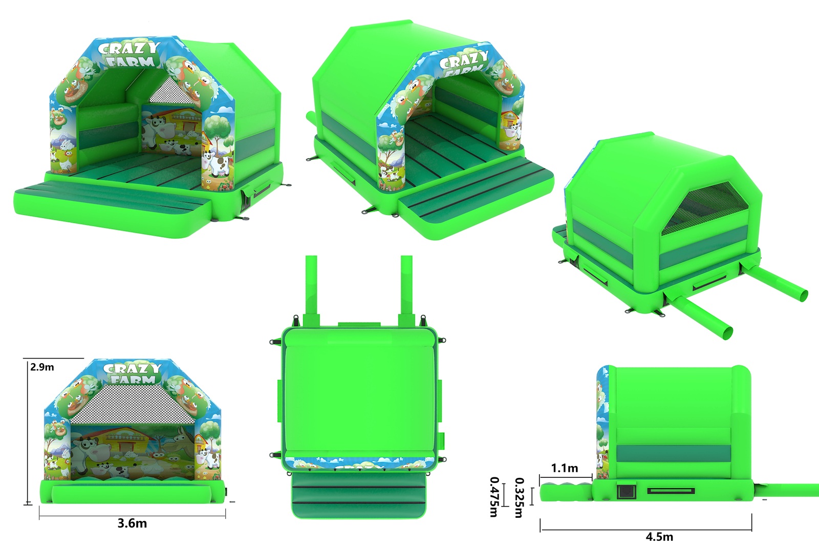 The Farmyard bouncy Castle offers a large safety step at the front which makes it easy for getting on and off the inflatable safely. The built-in rain cover protects the users from light showers and strong sunlight, depending on the time of year, making it perfect for all ages that may want to hire from you.