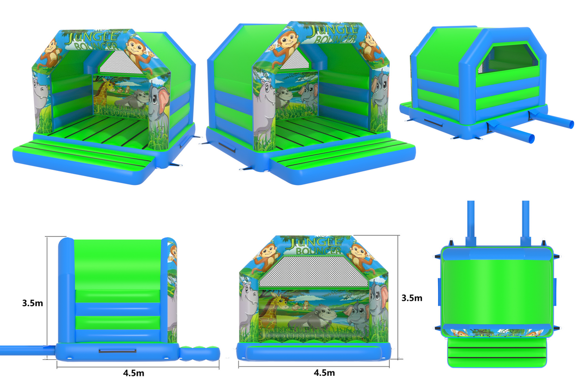 The Jungle Bouncy Castle offers a large safety step at the front which makes it easy for getting on and off the inflatable safely. The built-in rain cover protects the users from light showers and strong sunlight, depending on the time of year, making it perfect for all the parties or celebrations.