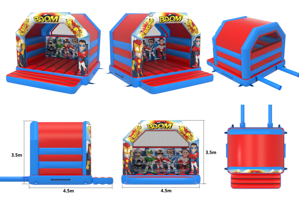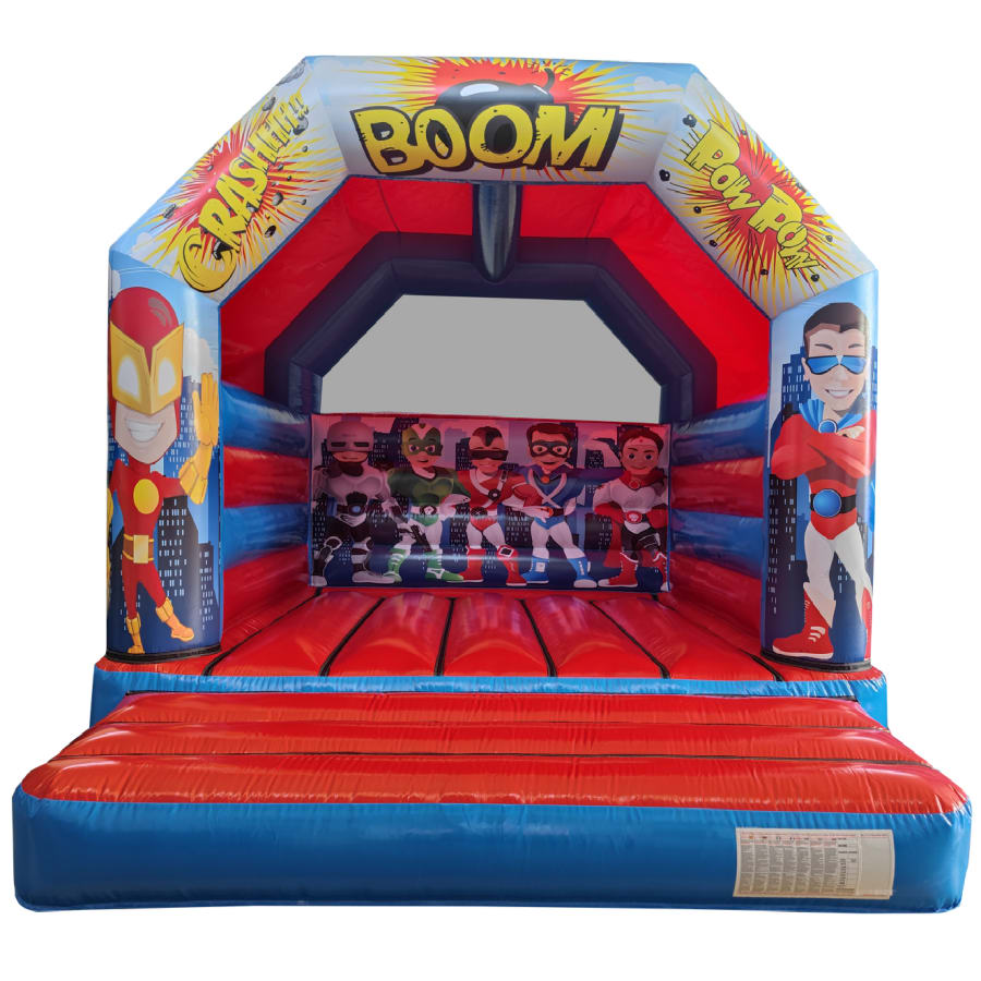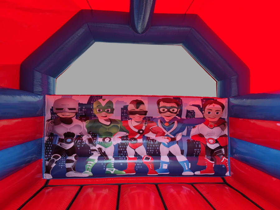 Here is our fantastic 15x15ft Superhero Bouncy Castle. Our 15x15ft Superhero bouncy castle is fantastic for any party, venue or occasion. The Superhero Castle is a great size and at only 11.5ft tall, it's ideal for both indoor or outdoor events. This Superhero bouncy castle will keep children entertained for hours, leaving you to be able to sit back and watch the little characters in the makings bounce, play, laugh, have fun and enjoy their day. The Superhero bounce castle artwork is both bold and bright with very realistic and absolutely fantastic quality images, ensuring the Superhero bouncy castle perfect for any party or event.