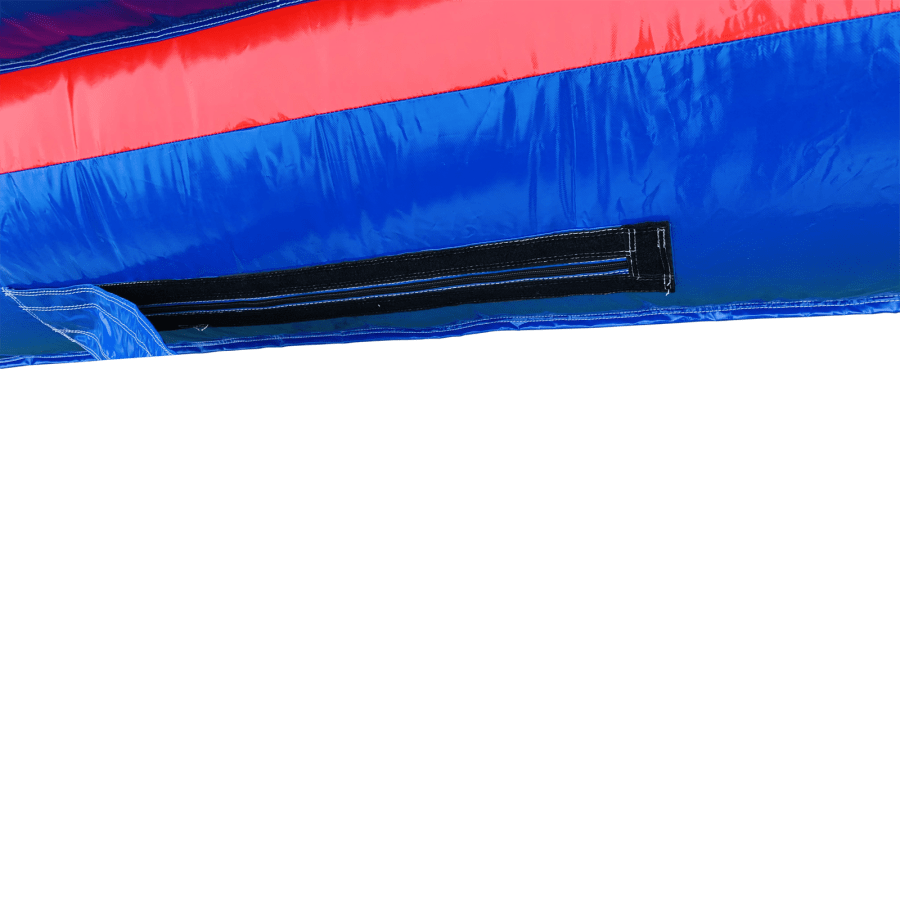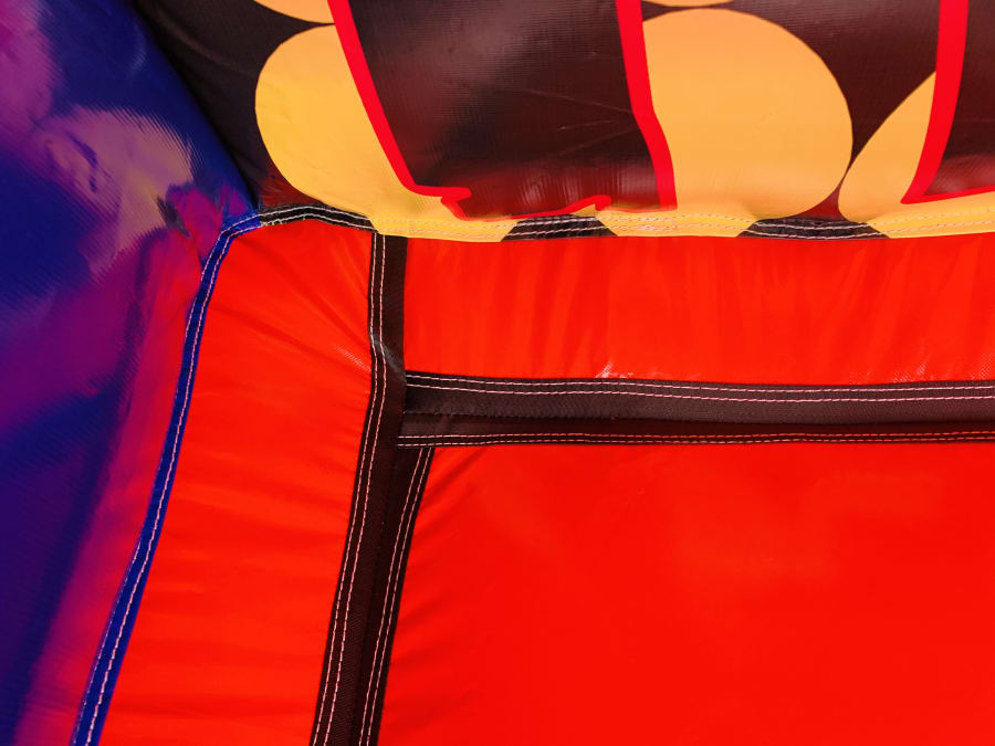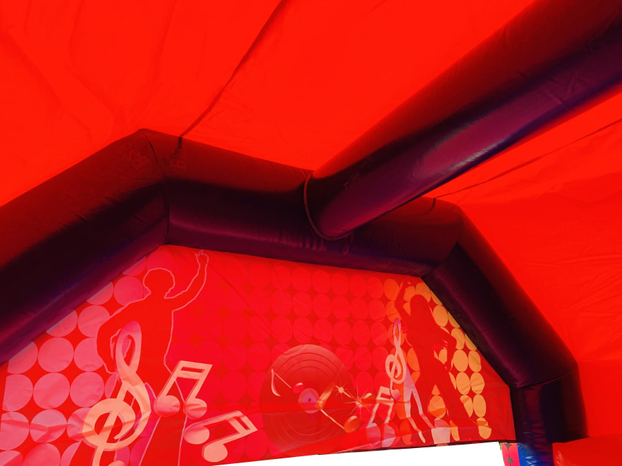The Inflatable Disco Castle comes with a lighting slot in the top that accepts most kinds of disco lighting, this is placed inside a clear plastic tube that allows light to penetrate inside the castle creating some really good effects inside. The slot is then zipped closed and a velcro cap is placed over to keep it watertight but please bear with us in heavy rain as nothing is quite 100% waterproof