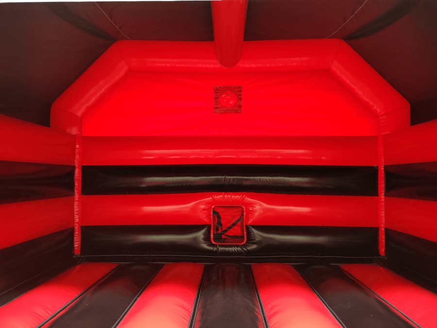 The Inflatable Disco Castle comes with a lighting slot in the top that accepts most kinds of disco lighting, this is placed inside a clear plastic tube that allows light to penetrate inside the castle creating some really good effects inside. The slot is then zipped closed and a velcro cap is placed over to keep it watertight but please bear with us in heavy rain as nothing is quite 100% waterproof