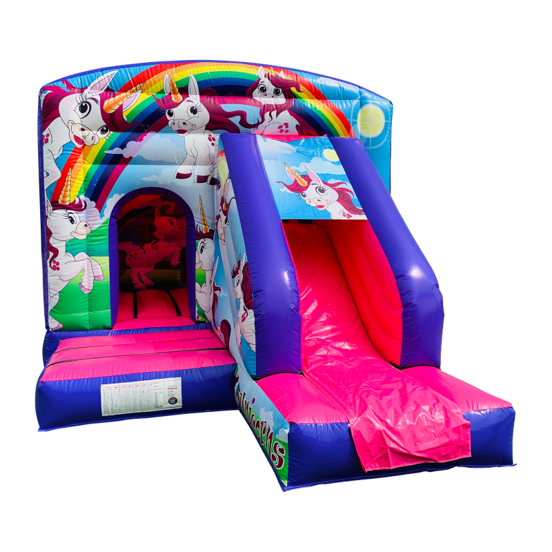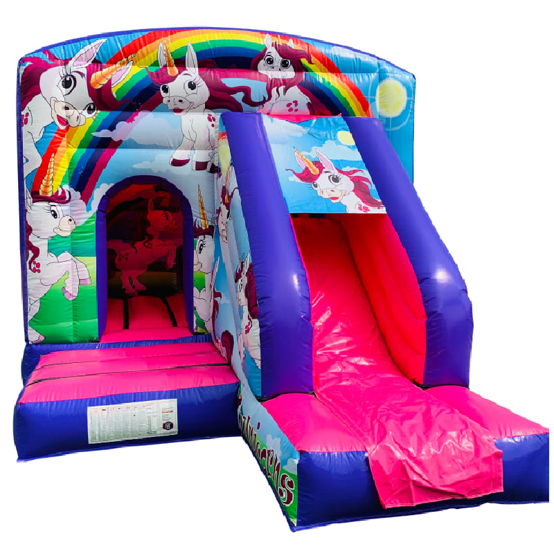The 12ft x 17ft Bouncy castle with slide is a fantastic new addition that can be added to your fleet. The bouncy castle with slide combines 2 of the most popular items in one extraordinary inflatable where space is at a premium. The bouncy castle with slide combo is the perfect combination slide for any party, venue or occasion and is ideal for all age groups. This brightly coloured piece of equipment provides the perfect bouncing area to bounce along with friends, whilst the slide provides entertainment for the rest of the guests at the same time and certainly won't break the bank.