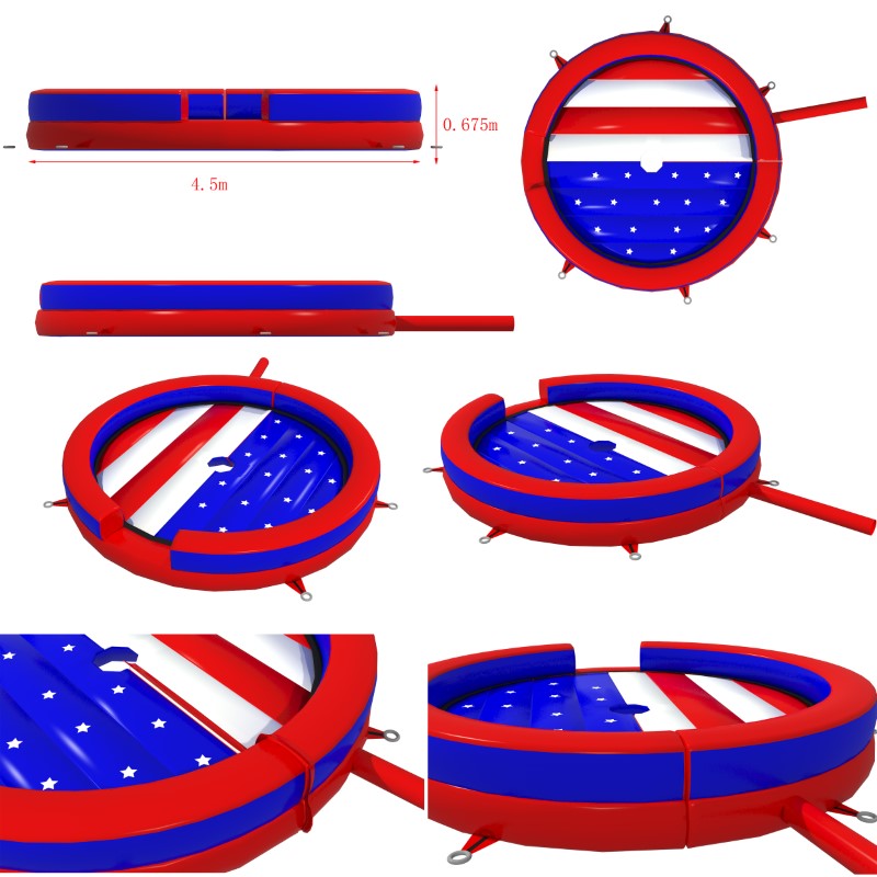 The inflatable bed features vibrant red, white, and blue coloring with a star pattern, giving it a fun and visually appealing design that suits a variety of event themes. Its sturdy construction can handle the rigorous demands of frequent use, making it perfect for both personal and professional needs. Each unit comes with a complete accessory package, including ground pegs, a durable peg bag, and a safety fall pad, ensuring the system is secure and ready for action straight out of the bag.