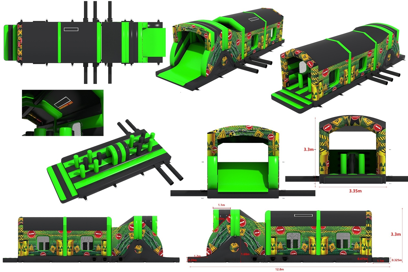The slide and obstacle section are 100% compliant as a stand-alone inflatable section for hire and are fully extendable. This allows for customization and flexibility in setting up the Toxic obstacle course to fit the specific needs and requirements of your event. The latest artwork theme is absolutely fantastic and is part of the high adrenaline games range, making this inflatable obstacle course the perfect choice for your event.