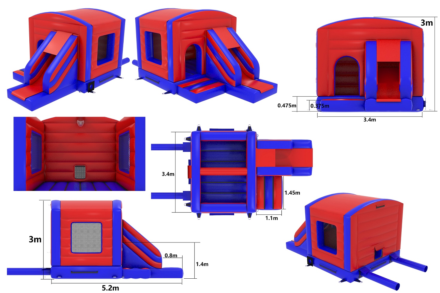 The bouncy castle with slide hire offers features such as firm step holds, Extra handrails and a netted roof to stop over adventurous children from climbing out ensuring maximum safety. The inflatable is perfect for entertaining a birthday party of around 15 children at any one time (not all at once of course) and is a really good slide choice is your planning a small school gala or summer fete where the smaller age range needs to be catered for. We also have a matching range of Bouncy castles, Ballpools, Soft play and other inflatables if you really want to go all out. This will be a battery powered design as standard but can be pre-wired upon request.