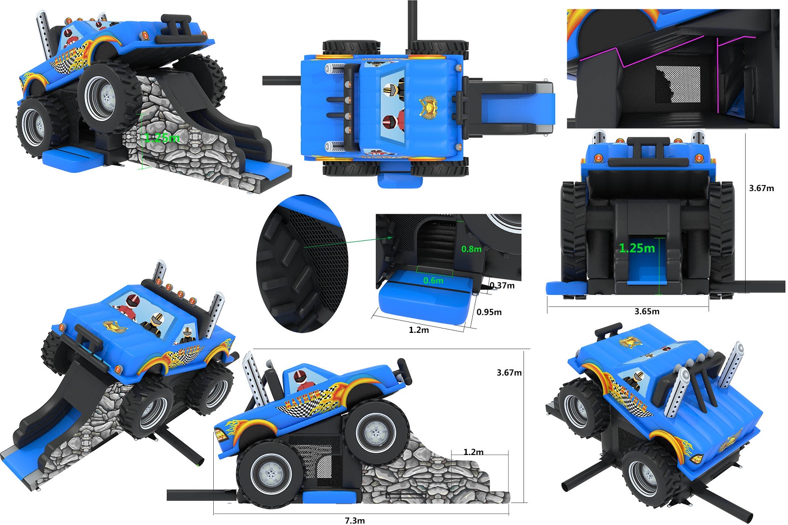 - The Monster Truck with Slide MK2 stands at an impressive 12ft, offering a visually stunning centerpiece for your event.