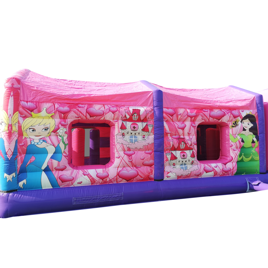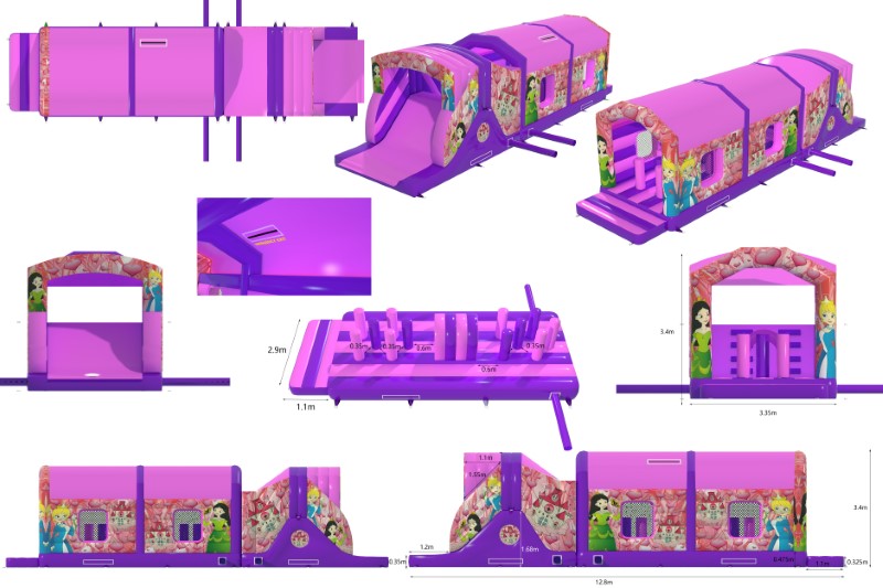 The pink and purple princess obstacle course incorporates an up and over slide, biff and bash, and bouncing area, hurdles, whackers, biff and bash posts, mini humps, obstacle humps, crawl through tunnels, and much more. It offers a safe entrance way with full theming and is followed by a random series of obstacles, including biff and bash pillars, a cool chill-out area in the middle, and hurdles. The course is finished with an adrenaline-fueled slide, making it the perfect choice for any children or adult event.