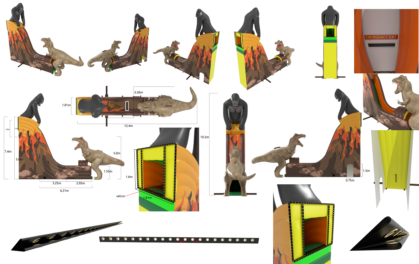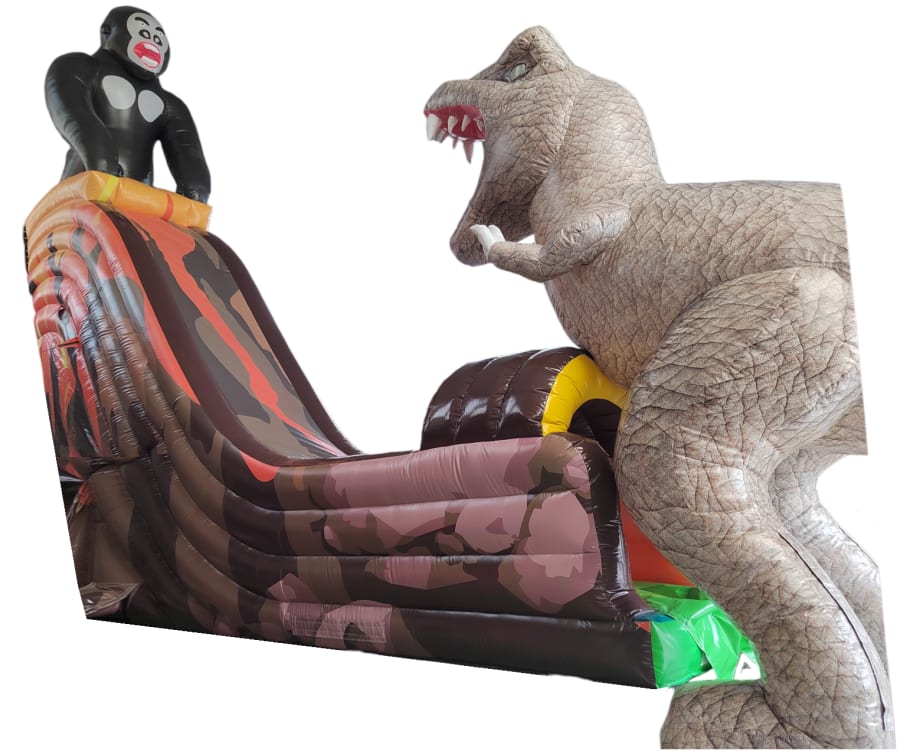 As you make your descent, the excitement continues to build, and at the base of the slide, you'll encounter a life-sized T-Rex inflatable, adding to the prehistoric drama of the volcano's eruption. Will you escape the volcanic fury and outrun the mighty dinosaur?