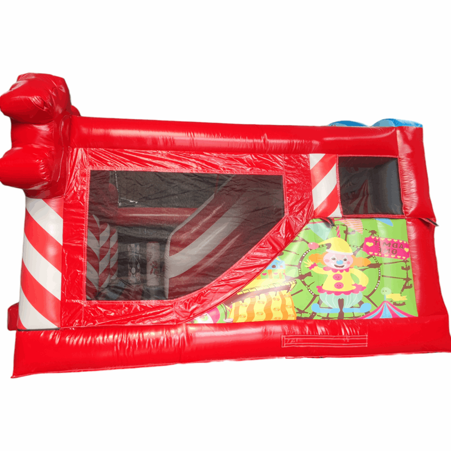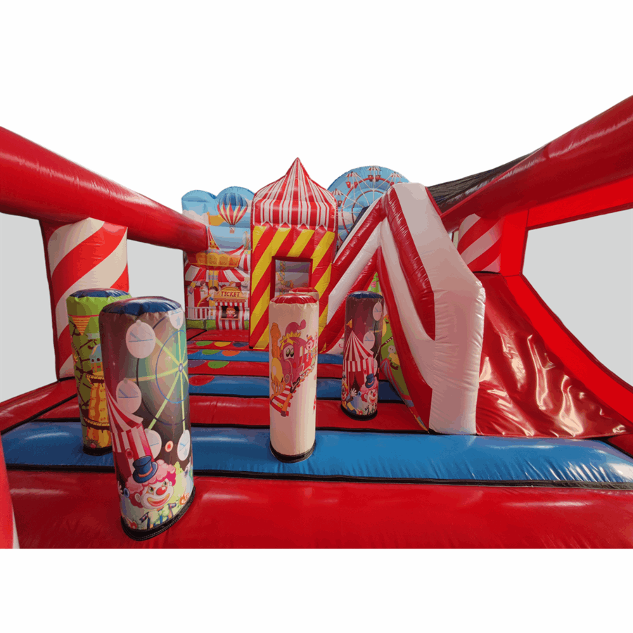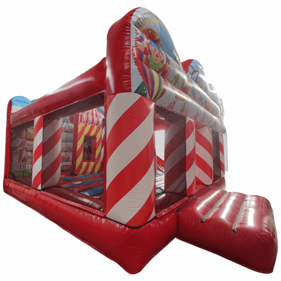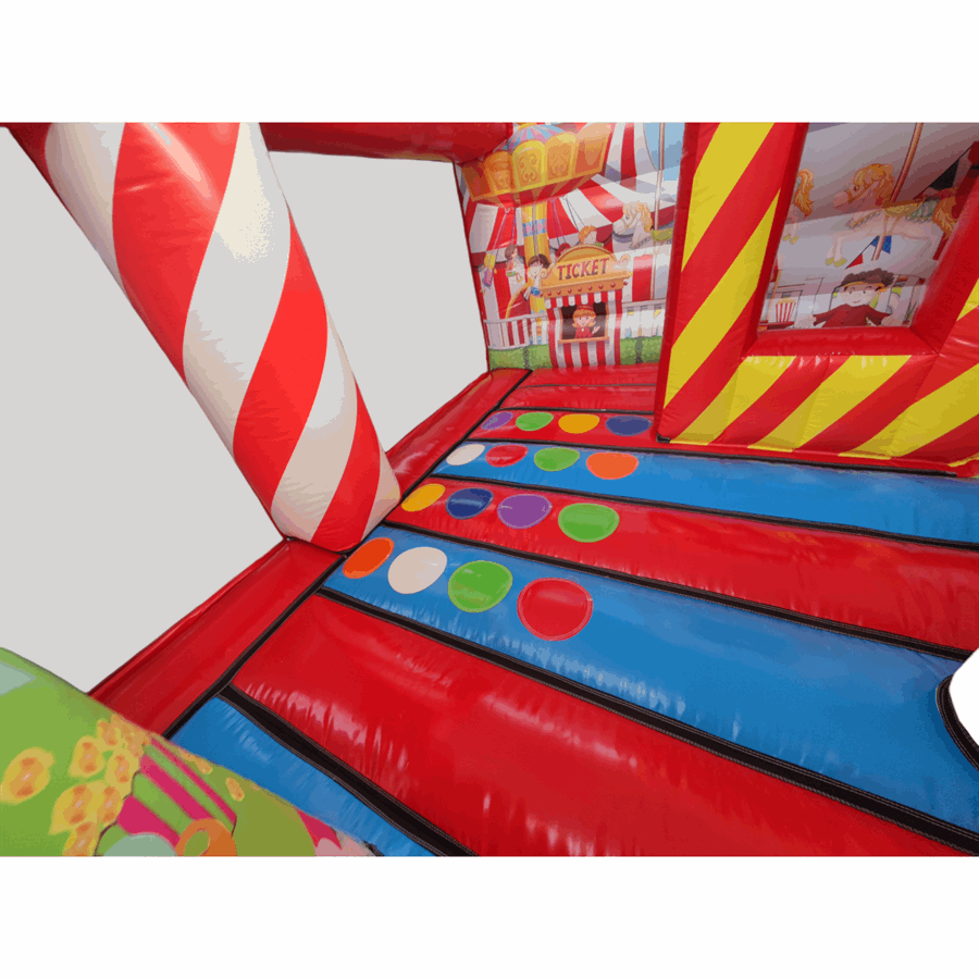 The inflatable funfair is themed up to replicate the look of the old town Fun-house seen at traditional fairgrounds worldwide and it's bound to bring all these childhood memories flooding back. It features a twister game style pay bed, carousel themes side wall, A circus stage arena, A punch and Judy style side stall, Interactive biff and bash pillars & features a slide in the corner and generally just an amazing funfair themed inflatable with an added bonus of a fully adult compliant bouncy castle designed specifically for all you big kids in life.