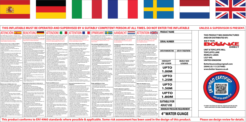 All our documentation and certification is available in multiple languages and All inflatable tags are designed to be interchangeable with reseller branding in under 1 minute, ensuring our products are ideal for distribution overseas.