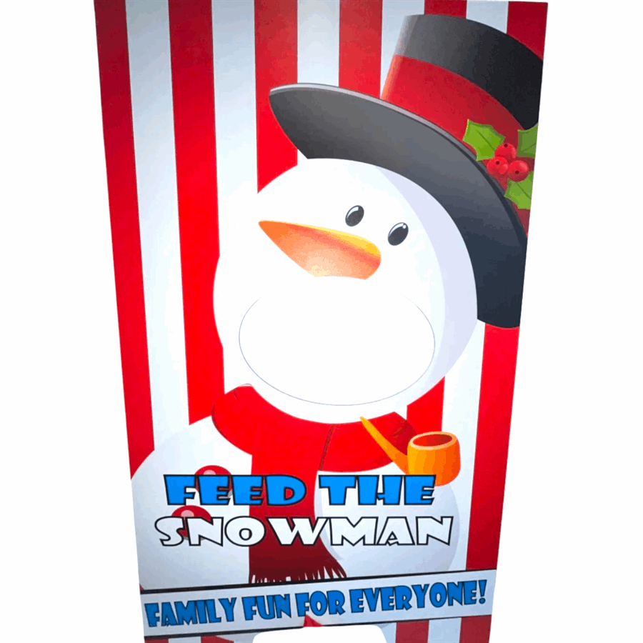 The aim of this funfair game is to throw three balls or bags into the snowman's mouth to fill him up. The first to get all 3 balls or bags in his mouth wins the game or a prize depending on how you have set up for the day.