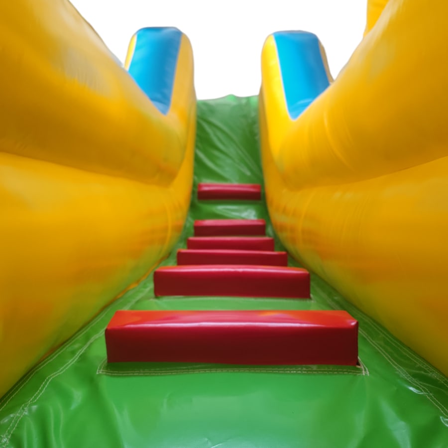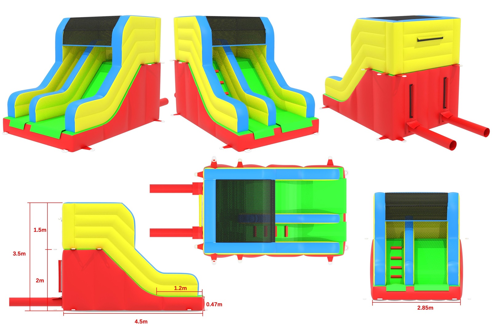 The side comes complete with detachable steps and slip sheet is a real head turner for the kids. The inflatable slide comes with detachable foam block steps, detachable slip sheet, light weight netted slide canopy. The slides roof features a special viewing tower for the little ones to get excited over and despite this, only measures at a modest 11ft yet making it perfect for indoor hire. The Bright 4 colour theme really is amazing and give an extra vibrant feel to all other items in its class.