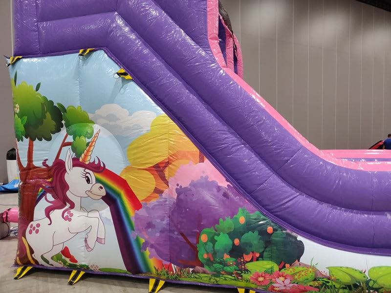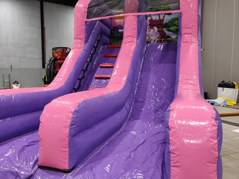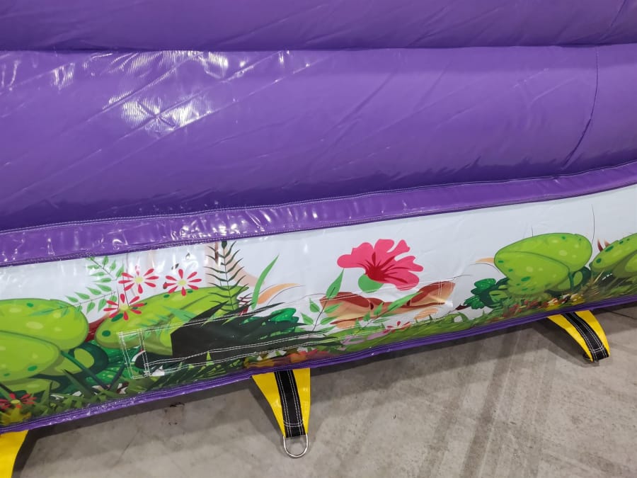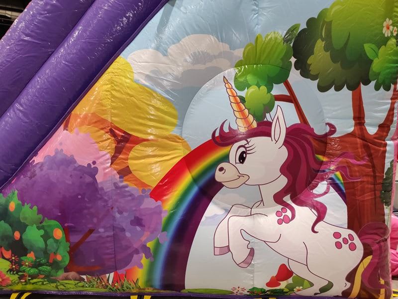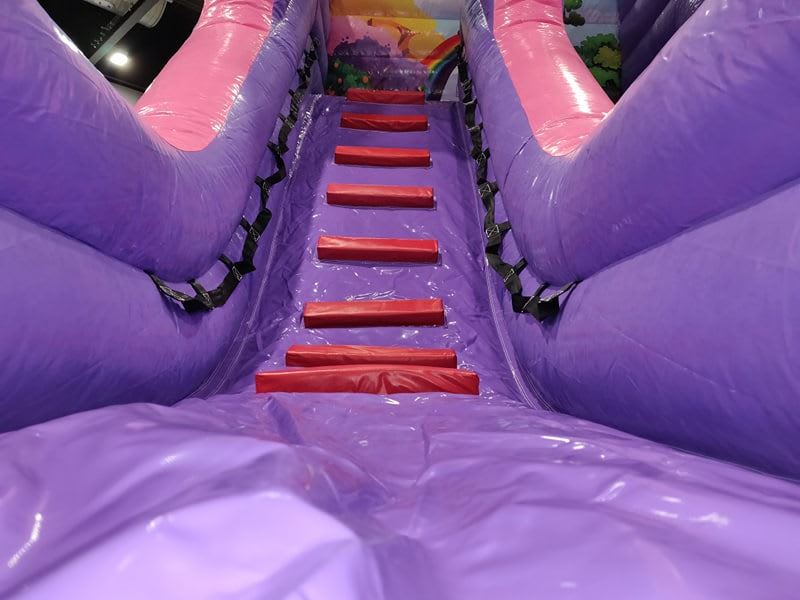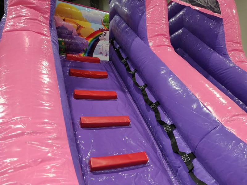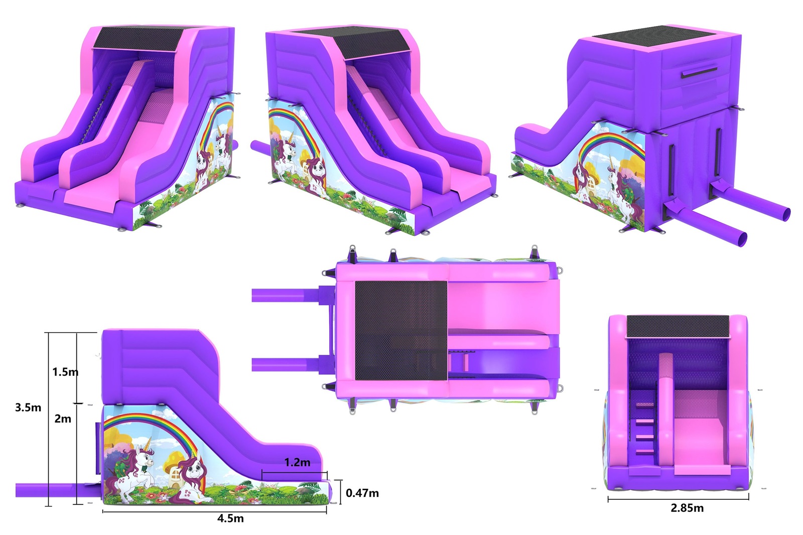 The side comes complete with detachable steps and slip sheet is a real head turner for the kids. The inflatable slide comes with detachable foam block steps, detachable slip sheet, light weight netted slide canopy. The slides roof features a special viewing tower for the little ones to get excited over and despite this, only measures at a modest 11ft yet making it perfect for indoor hire. The Bright 4 colour theme really is amazing and give an extra vibrant feel to all other items in its class.