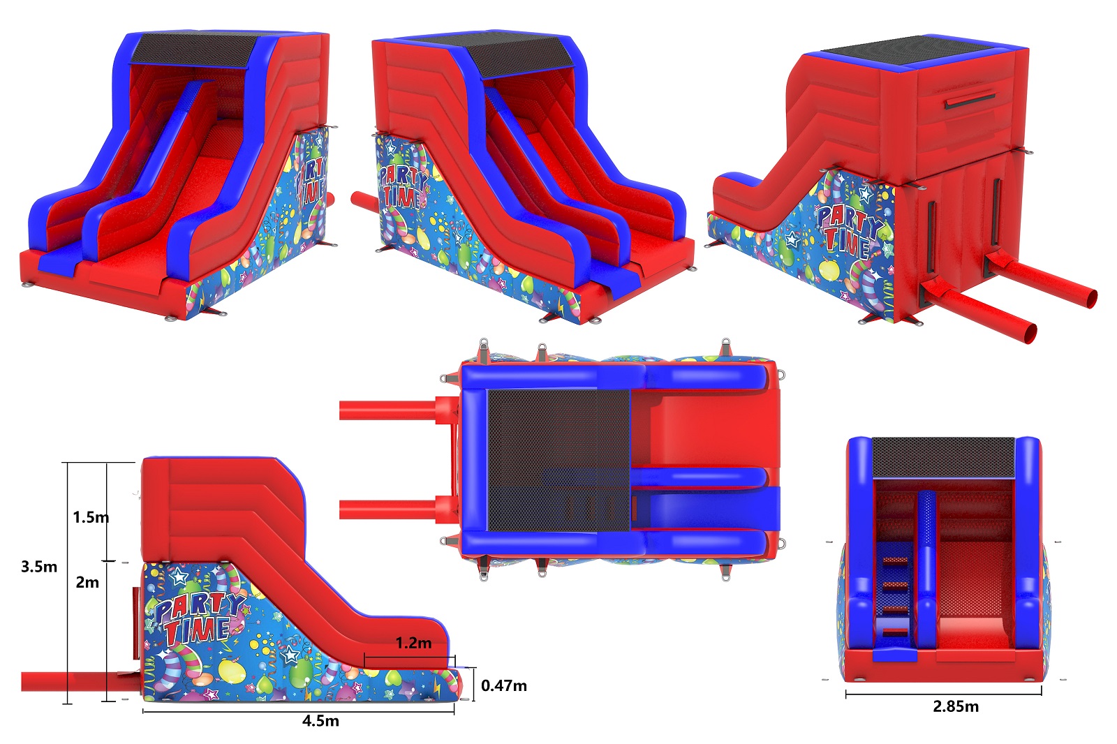 The side comes complete with detachable steps and slip sheet is a real head turner for the kids. The inflatable slide comes with detachable foam block steps, detachable slip sheet, light weight netted slide canopy. The slides roof features a special viewing tower for the little ones to get excited over and despite this, only measures at a modest 11ft yet making it perfect for indoor hire. The Bright 4 colour theme really is amazing and give an extra vibrant feel to all other items in its class.