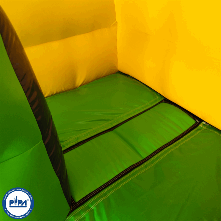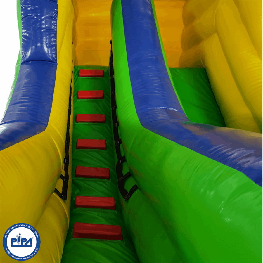 The side comes complete with detachable steps and slip sheet is a real head turner for the kids. The inflatable slide comes with detachable foam block steps, detachable slip sheet, light weight netted slide canopy. The slides roof features a special viewing tower for the little ones to get excited over and despite this, only measures at a modest 11ft yet making it perfect for indoor hire. The Bright 4 colour theme really is amazing and give an extra vibrant feel to all other items in its class.