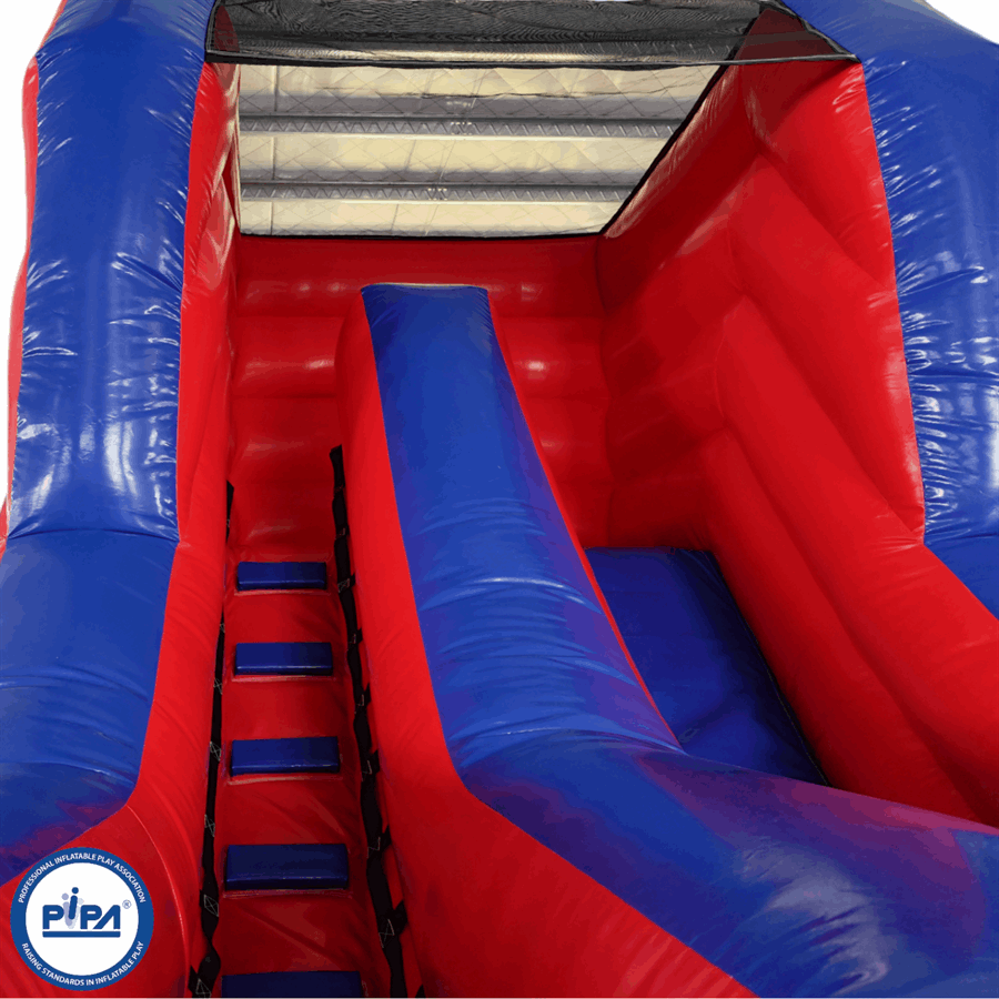 The side comes complete with detachable steps and slip sheet is a real head turner for the kids. The inflatable slide comes with detachable foam block steps, detachable slip sheet, light weight netted slide canopy. The slides roof features a special viewing tower for the little ones to get excited over and despite this, only measures at a modest 11ft yet making it perfect for indoor hire. The Bright 4 colour theme really is amazing and give an extra vibrant feel to all other items in its class.
