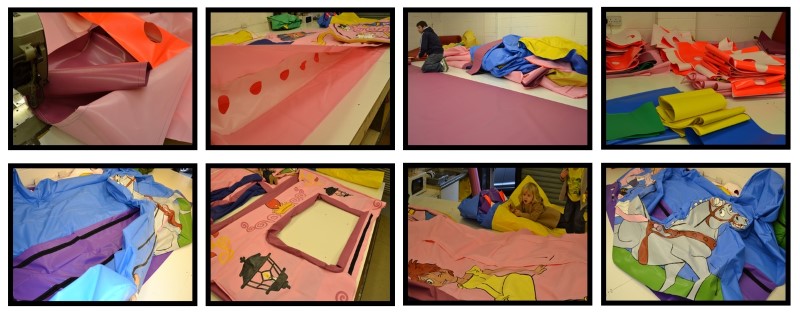 Once all artwork has been completed the artwork panels are piled together with the parts we cut earlier and construction begins. The inflatable is sewn together using a top of the range twin needle, walking foot industrial sewing machine on an inline rail track to ensure the straightest possible lines are achieved and no weak points are left behind.Once the design model was complete, we again stripped the model down into parts and stacked them according to colour. We then stacked the parts on our virtual material to achieve maximum efficiency. once we were happy with the idea we sent the files over to our CNC cutting machine for the parts to be automatically cut out to within a 100th of a mm.Once we were happy with the concept and knew from the visual sketches what we wished the finished product to look like, we imported the sketches into our technical design software and began to design the product. The design took approximately 6 days to ensure everything was correct and the way we intended it to be.