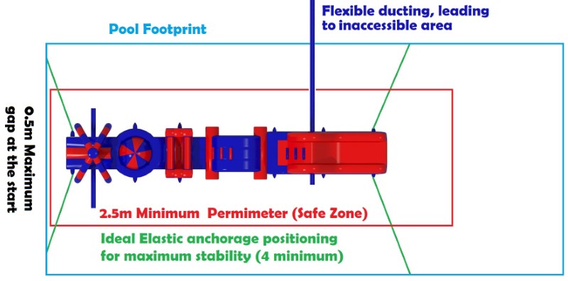 - Please ensure the inflatable has a clear 2.5m safe zone from any obstruction, which includes the edge of the pool.