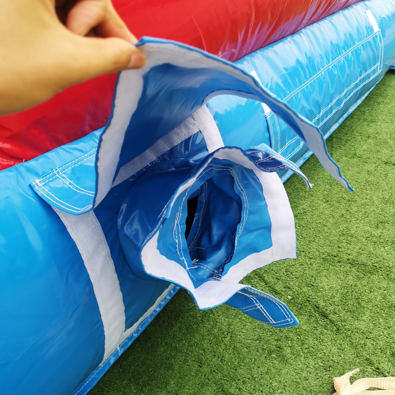 The first product we manufactured was the BBOL-164-12x15-(VPC), which was a standard 12x15 A-frame bouncy castle with a standard Velcro ball pool. We added a clever Velcro flap and tube system to the castle that allowed air to safely exit the inflatable when necessary and pass air to the ball pool. Additionally, we added a foldable Velcro patch at the back of the inflatables to conceal the tube when not in use. The idea is simple but very effective when used.